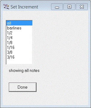 Use the Set Increment form, on the Spect menu on M+O's Main Form, shown above, to choose the notes that are marked with vertical lines, as well as clicks or plucks during Rehearsal Review.