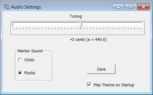 Move the "Tuning" slider to choose the overall pitch the accompaniment will use.  This setting will affect the pitch of the audio created by M+O in the future.  The pitch level is displayed both as a change in "cents" (there are 100 cents in a semitone or half step), and as the frequency, in Hz or cycles per second, of the corresponding tuning "A."  You shouldn't take this latter number too literally: if you make no change to the tuning level, the Audio Settings display calls this A=440 Hz.  Whether or not this is 440 Hz in reality depends on the tuning of the original accompaniment recording.  However, +2 cents does literally mean that audio is played back 2 cents higher than it was originally recorded.