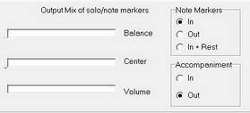 • When both Accompaniment and Note Markers are set to "Out," both channels are devoted to the solo audio while the text reads "Output Mix of solo/solo."  In this case the Balance and Center slider have no effect since the two channels are identical.